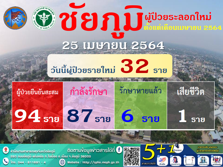 เมื่อวันที่ 25 เมษายน 2564 ผู้สื่อข่าวรายงานความคืบหน้าสถานการณ์ การแพร่ระบาดโควิด-19 ในพื้นที่จังหวัดชัยภูมิ โดยล่าสุดวันนี้ นายกอบชัย บุญอรณะ ผู้ว่าราชการจังหวัดชัยภูมิ ได้รับรายงานจากนายแพทย์วชิระ บถพิบูลย์ นายแพทย์สาธารณสุขจังหวัดชัยภูมิ และโฆษกคณะกรรมการควบคุมโรคติดต่อจังหวัดชัยภูมิ หลังวานนี้ (24 เม.ย.64) พบมีผู้ติดเชื้อรายวันระลอกใหม่เพิ่มขึ้นอีก จำนวน 8 ราย สะสมรวม 62 ราย รักษาหาย 6 ราย กำลังรักษา 56 ราย และมีผู้เสียชีวิตแล้ว 1 ราย เป็นชายสูงอายุวัย 92 ปี ชาว อ.คอนสวรรค์ ผู้ป่วยยืนยันตรวจพบติดเชื้อมาตั้งแต่วันที่ 20 เม.ย.64 เป็นรายที่ 37 ของ จ.ชัยภูมิ ซึ่งมีประวัติติดจากญาติ ลูกหลานเดินทางมาจากจังหวัดเสี่ยงมาเยี่ยมบ้านช่วงสงกรานต์ที่ผ่านมา