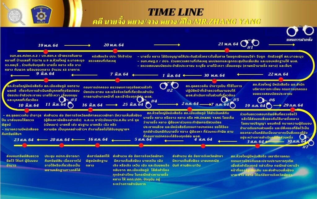 พล.ต.ท.ธิติ กล่าวถึงเงื่อนเวลาในการสอบสวน ว่า ได้จับกุม นายจั๋ง หยาง ผู้ต้องหา เมื่อวันที่ 19 พฤษภาคม 64 จากนั้นได้แจ้งเลขาธิการ ปปง.ให้ดำเนินการตรวจสอบทรัพย์สินตามกฎหมายฟอกเงิน วันที่ 20 พฤษภาคม 64 ยื่นฝากขังต่อศาลจังหวัดพัทยาไปเมื่อวันที่ 21 พฤษภาคม 64 ได้สรุปสำนวนส่งอัยการเมื่อวันที่ 3 สิงหาคม 64 ต่อมาวันที่ 20 สิงหาคม 64 ที่ประชุมคณะกรรมการสอบสวนเกี่ยวกับทรัพย์สินที่ตรวจยึด มีมติคืนสิ่งของให้แก่ผู้ต้องหา และวันที่ 23 สิงหาคม 64 ได้คืนทรัพย์สินผู้ต้องหา โดยมีน้องชายพร้อมทนายความเป็นตัวแทนรับมอบ