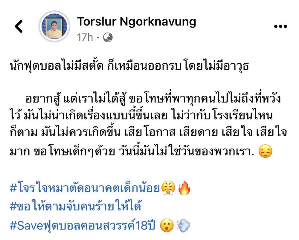 ทั้งนี้คุณครูโรงเรียนคอนสวรรค์ก็ได้ออกมาโพสต์ประณามคนขโมยรองเท้าสตั๊ดผ่านเฟซบุ๊กส่วนตัวในชื่อ “Torslur Ntorknawung” โดยโพสต์ว่า “นักฟุตบอลไม่มีสตั๊ด ก็เหมือนออกรบโดยไม่มีอาวุธ อยากสู้ แต่เราไม่ได้สู้ ขอโทษที่พาทุกคนไปไม่ถึงที่หวังไว้ มันไม่น่าเกิดเรื่องแบบนี้ขึ้นเลย ไม่ว่ากับโรงเรียนไหนก็ตาม มันไม่ควรเกิดขึ้น เสียโอกาส เสียดาย เสียใจ เสียใจมาก ขอโทษเด็กๆด้วย วันนี้มันไม่ใช่วันของพวกเรา” พร้อมแฮชแท็ก โจรใจหมาตัดอนาคตเด็กน้อย ขอให้ตามจับคนร้ายให้ได้ และ Saveฟุตบอลคอนสวรรค์18ปี