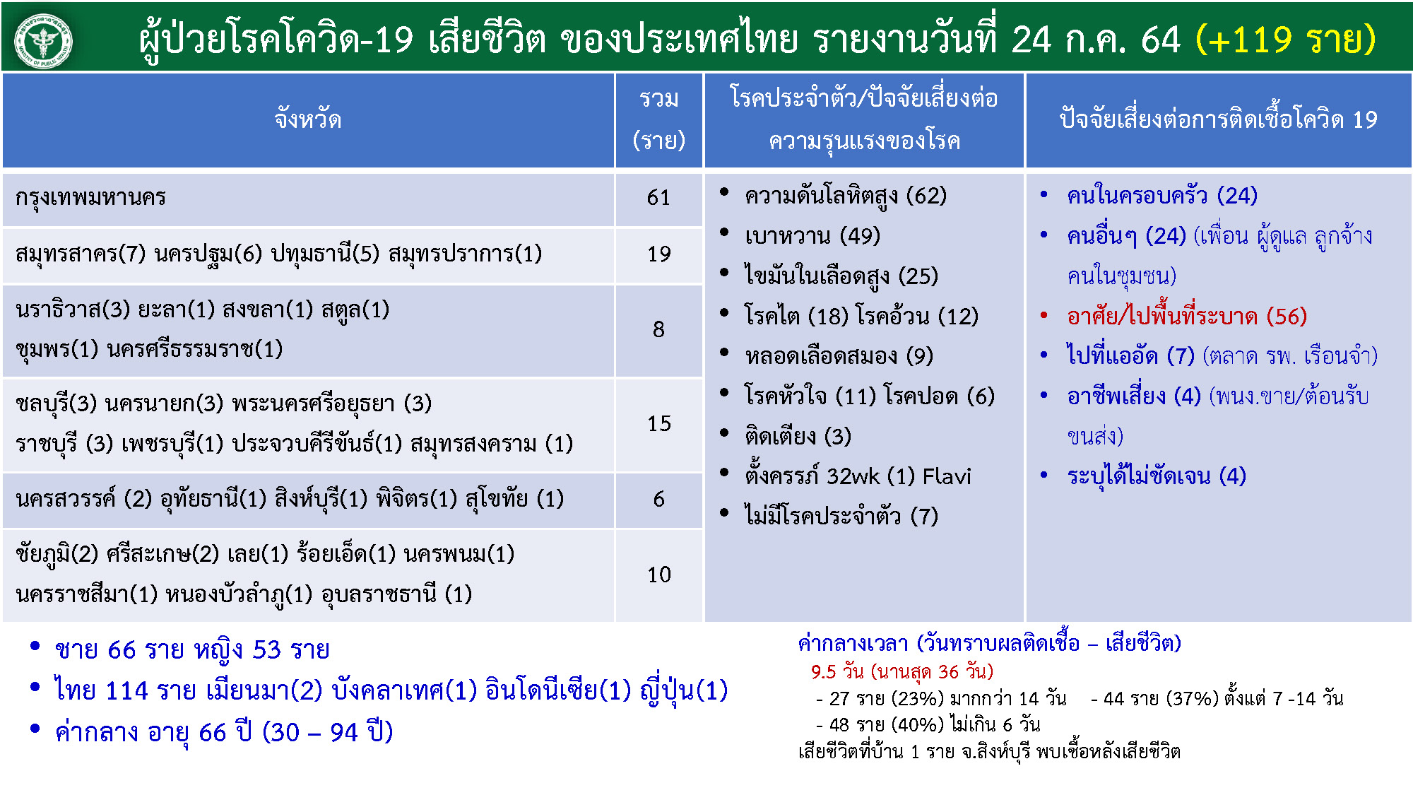 ข้อมูลของผู้เสียชีวิตรายใหม่ทั้ง 119 ราย พบมากสุดในกรุงเทพมหานคร 61 ราย สมุทรสาคร 7 ราย นครปฐม 6 ราย ปทุมธานี 5 ราย สมุทรปราการ 1 ราย นราธิวาส 3 ราย ยะลา 1 ราย สงขลา 1 ราย สตูล 1 ราย ชุมพร 1 ราย นครศรีธรรมราช 1 ราย
