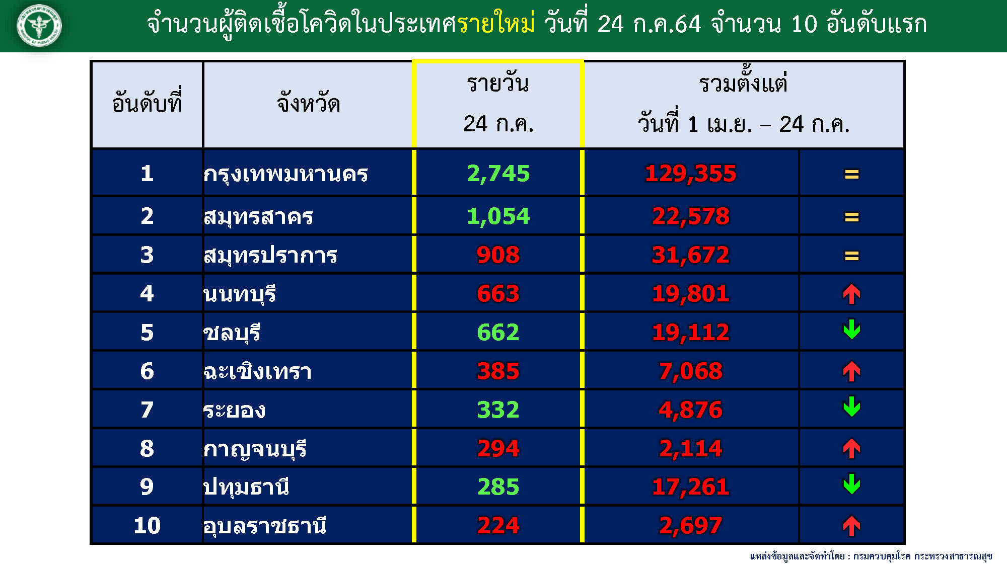ส่วนจำนวนผู้ติดเชื้อรายใหม่ ใน 10 จังหวัดแรก ได้แก่ กรุงเทพมหานคร 2,745 ราย สมุทรสาคร 1,054 ราย สมุทรปราการ 908 ราย นนทบุรี 663 ราย ชลบุรี 662 ราย ฉะเชิงเทรา 385 ราย ระยอง 332 ราย กาญจนบุรี 294 ราย ปทุมธานี 285 ราย อุบลราชธานี 224