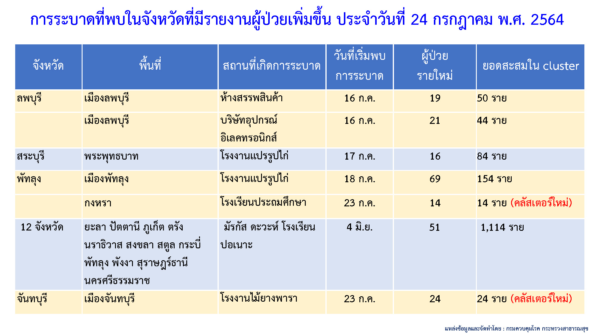 - สมุทรสาคร : อ.เมืองสมุทรสาคร จากโรงงานอาหารแช่แข็ง 15 ราย และบริษัทผักผลไม้พร้อมทาน 20 ราย