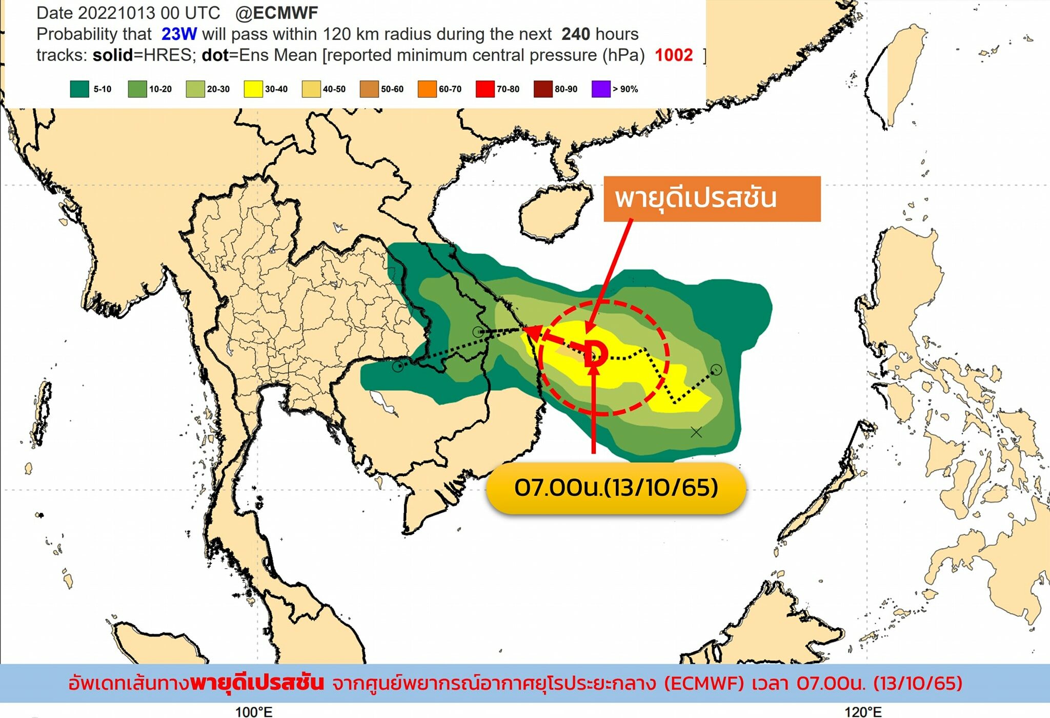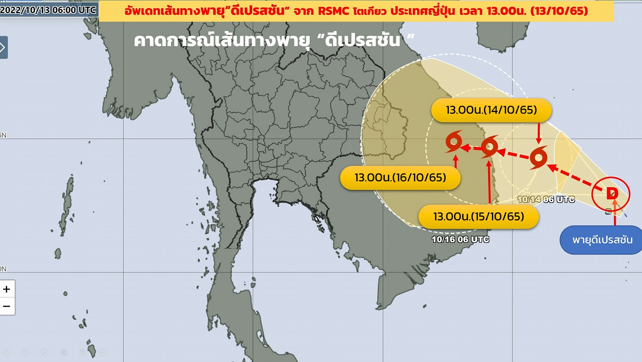 เมื่อวันที่ 13 ตุลาคม กรมอุตุนิยมวิทยา อัพเดตสถานการณ์พายุเมื่อเวลา 13.00 น.ที่ผ่านมา พบว่า พายุดีเปรสชั่น จาก RSMC โตเกียว ประเทศญี่ปุ่น มีศูนย์กลางบริเวณด้านตะวันออกชายฝั่งประเทศเวียดนาม กำลังเคลื่อนตัวทางตะวันตก คาดว่าขึ้นฝั่งประเทศเวียดนามในค่ำวันพรุ่งนี้ (14 ตุลาคม) แต่จะอ่อนกำลังลงเมื่อเคลื่อนขึ้นฝั่ง ยังต้องติดตามต่อเนื่อง เนื่องจากทิศทางหรือเวลายังเปลี่ยนแปลง