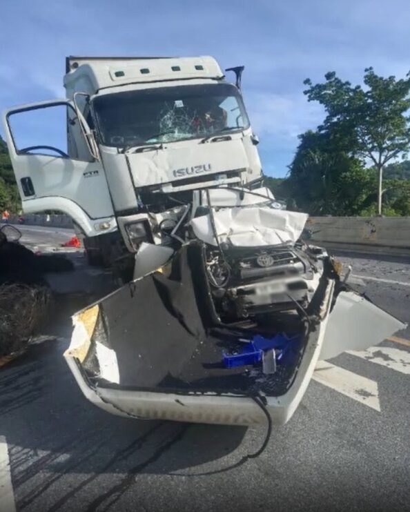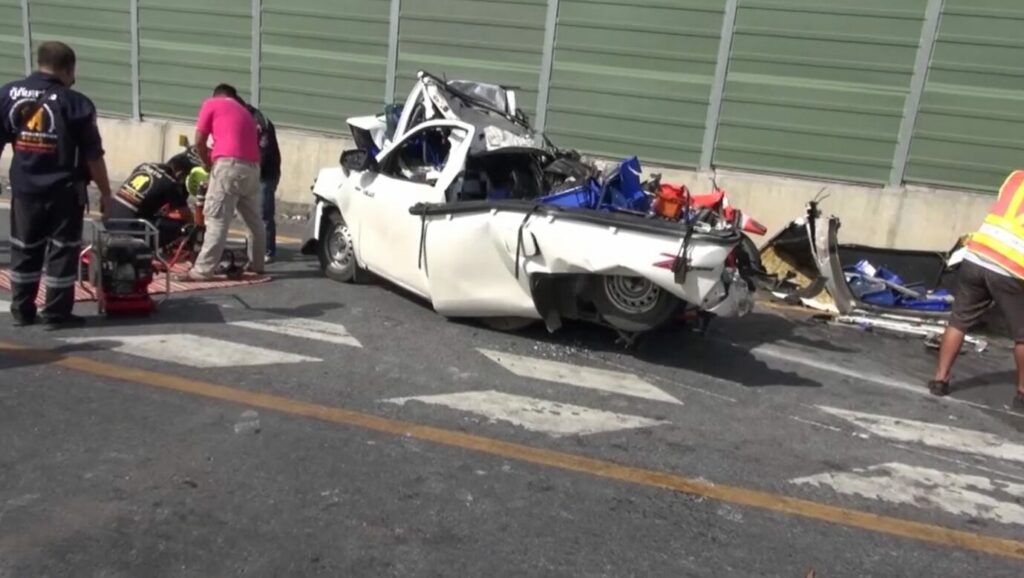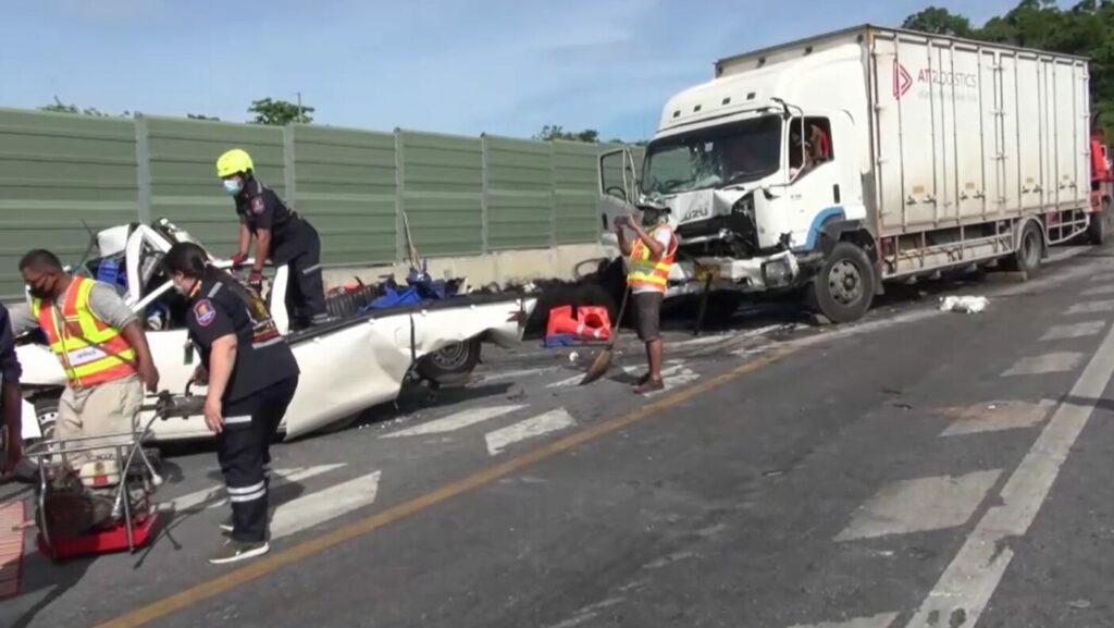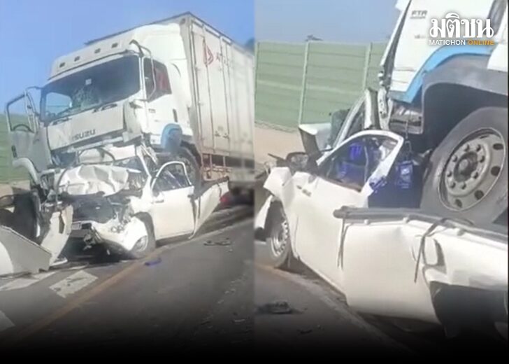 อุบัติเหตุซ้อน รถพ่วงขนเส้นลวดพลิกคว่ำ กระบะชะลอดู เจอ 6 ล้อลงเขาเบรกแตกพุ่งชน ดับ 1